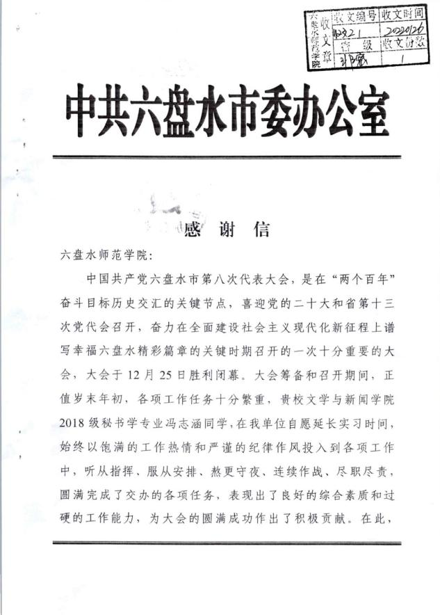 近日,bat365在线中国登录入口收到来自中共六盘水市委办公室市第八次党代会大会秘书处的一封感谢信,感谢bat365文学与新闻学院2018级秘书学专业实习生冯志涵同学对中国共产党六盘水市第八次代表大会的大力支持和辛勤付出。