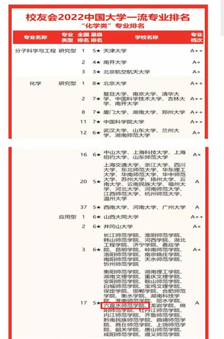 校友会中国大学一流专业排名是目前中国参评大学数量最多和参评专业规模最大的中国大学本科专业排名。bat365化学专业入选全国五星级专业,标志bat365化学专业在人才培养质量、学科建设水平、专业建设水平等方面影响稳步提升。(供稿/李爱静 编辑校对/耿忠武 审核/王毅红 陈定梅)
