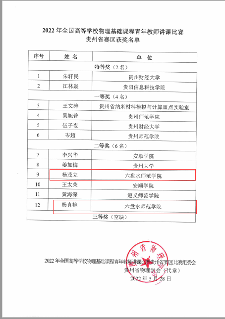 近日,物理与电气工程学院组织青年老师参加了2022年全国高等学校物理基础课程青年教师讲课比赛贵州省赛。经过激烈的角逐,杨茂立和杨真艳两位老师取得了二等奖的佳绩!