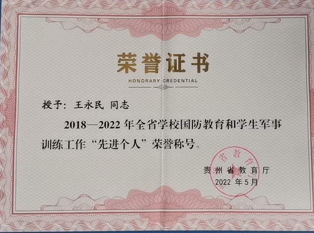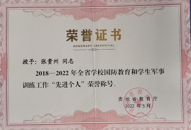 5月31日,贵州省教育厅表彰了2018-2022年全省学校国防教育和学生军事训练工作先进单位和个人,bat365荣获“先进单位”荣誉称号,武装部部长张贵州、副部长王永民荣获“先进个人”荣誉称号。