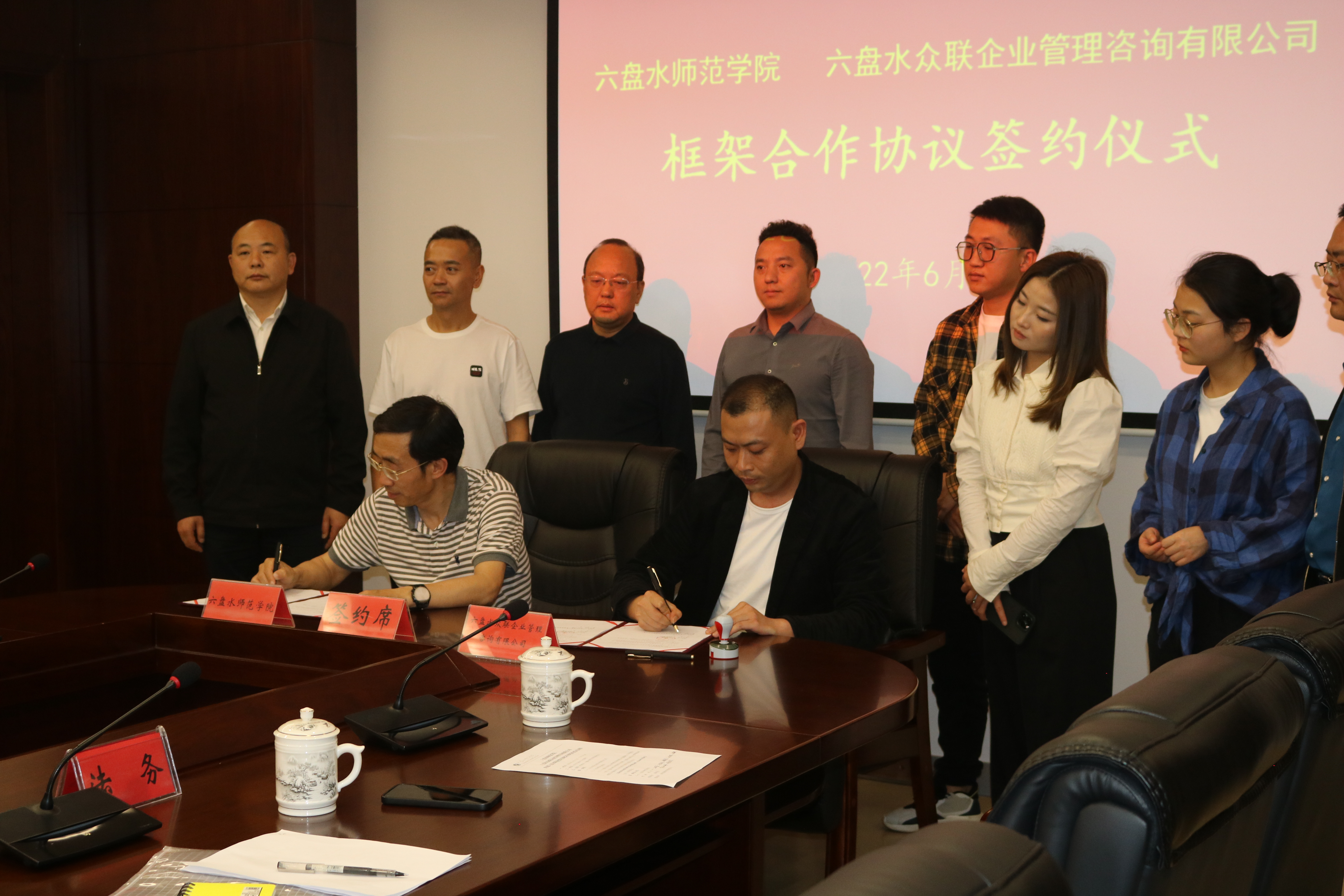 6月7日,bat365与六盘水众联企业管理咨询有限公司共建六盘水职业类培训综合体签约仪式在学术交流中心至善厅举行,校长何林,副校长程绪权,对外交流合作处处长张武、继续教育学院院长张凌峰,六盘水众联企业咨询管理有限公司董事长万洋等领导出席,程绪权副校长主持签约仪式。