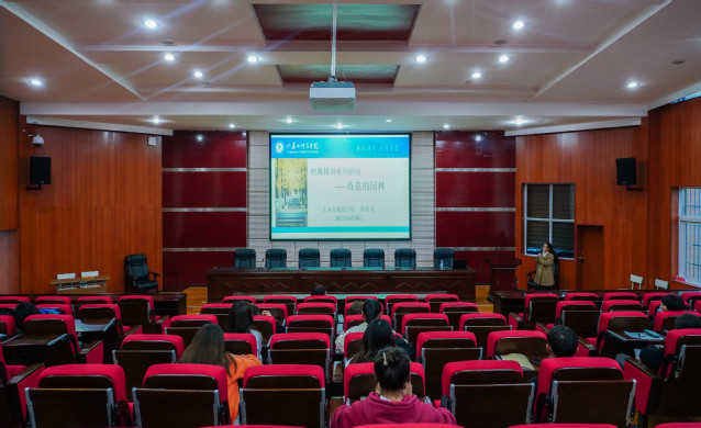 “当诗意遇到园林时会怎样呢?”李海荣以提问的形式引发在场师生思考,并举山西洪洞县以槐树记思乡之情的枯木景观的例子说明文化与景观“你中有我,我中有你”的交融关系。正如滕王阁的景观与《滕王阁序》间,好的园林景观给诗人提供灵感创作诗词,诗词的出现也给了建筑灵魂,如苏堤、断桥残雪、颐和园等中国山水园林景观所体现出的“一池三山”的园林模式,园林建设者在造园时采用联想的手法,利用山水交融的景观提高了园林所带给人们的愉悦感,具有人与自然和谐、有山有水、写意的特点,体现了园林所追求的“天人合一”的思想。李海荣认为,大自然是创新思维的来源,多观察生活中的景观,养成“绿水青山就是金山银山的理念”,能为生态文明建设贡献一份力量。