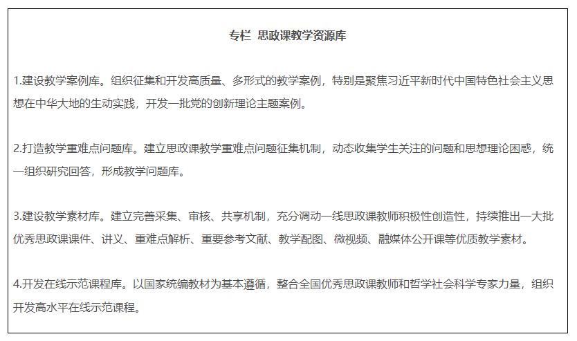 12.推进国家智慧教育平台建设使用。教育部把“大思政课”摆在教育信息化的突出位置,加强国家智慧教育平台思政教育资源建设。通过项目支持的方式,推动教学资源建设常态化机制化。组织开发和推荐一批科学权威实用的课件、讲义,推动一线教师统一使用。加强思政课教学资源库建设,实施中小学思政课精品课程建设计划,推出一批思政“金课”。加大优质资源推广使用力度,指导各地各校用好国家智慧教育平台。