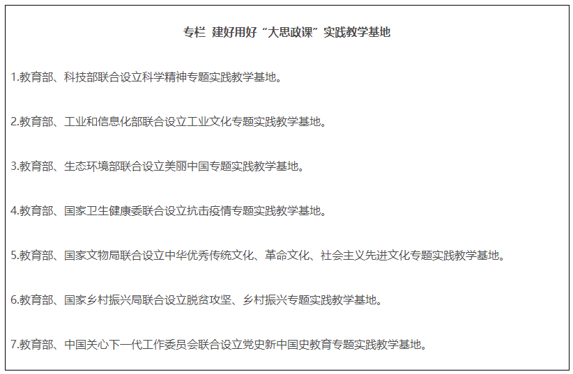 10.建好用好实践教学基地。教育部会同有关部门,利用现有基地(场馆),分专题设立一批“大思政课”实践教学基地。发挥好教育部高校思政课教师研学基地的实践教学功能。各地教育部门要结合实际,积极建设“大思政课”实践教学基地。大中小学要主动对接各级各类实践教学基地,开发现场教学专题,开展实践教学。有条件的学校可与有关基地建立长效合作机制,加强研究和资源开发。各基地要积极创造条件,与各地教育部门、学校建立有效工作机制,协同完成好实践教学任务。