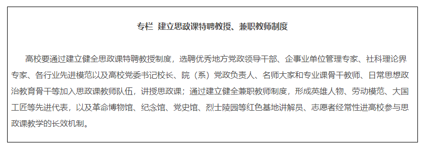 14.建设专兼结合的师资队伍。各地各校严格按照要求配备建强高校专职思政课教师、辅导员队伍,提高中小学专职思政课教师比例,实行思政课特聘教授、兼职教师制度,积极聘请党政领导、科学家、老同志、先进模范等担任思政课兼职教师。深入实施马克思主义学院院长(书记)培养工程,通过集中培养培训、委托重大项目、加强实践锻炼、开展国际国内访学等方式,培养一批青年马克思主义理论家。