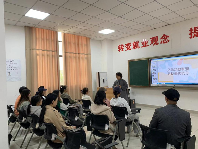 招聘会上,园长楼于勤向大家做了简单的自我介绍,随后从义乌幼儿园情况、实习和就业要求、管理模式以及培训形式等方面展开阐述,其中包括幼儿园的占地面积、教学背景、教学及教师宿舍环境等。为了提高学生就业热情,增加求职、学习动力,楼于勤还向大家展示了幼儿园教师团队的培训过程,向同学们详细讲述了教师职业发展晋升路程。最后,在提问互动环节,就同学们感兴趣的薪资待遇方面进行了详细的讲解。