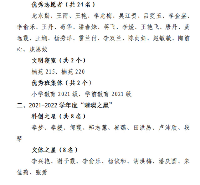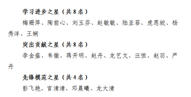 本次表彰活动设优秀学生干部、优秀党员、科创之星等11个奖项。其中2个班级荣获优秀班集体、2个寝室荣获文明寝室和50名同学获得学院奖,36名同学获得“璀璨之星”奖项。