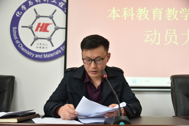 4月14日上午,化学与材料工程学院本科教育教学审核评估动员大会在奥学楼420会议室召开。学院党委书记陈定梅,党委副书记王毅红,副院长袁杰,党委委员、专职组织员张绪勇出席会议。会议由陈定梅主持。