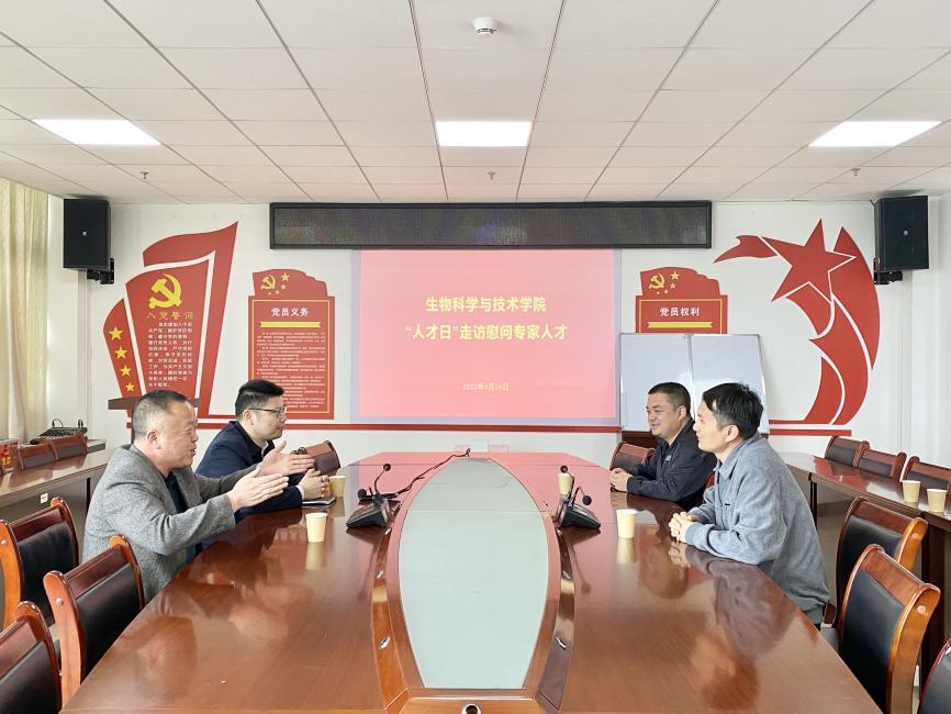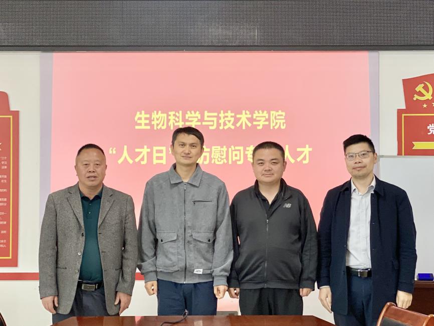4月26日上午,在2023年“人才日”到来之际,生物科学与技术学院党委书记王家理,党委副书记、院长熊荣川到奥学楼A623会议室慰问六盘水魔芋产业技术研究院负责人、教授方玉梅,学院学科团队分子育种方向学术带头人、副教授张书东博士,六盘水猕猴桃产业技术研究院负责人、学院学科团队山地高效特色农业研究方向学术带头人、副教授韩世明博士和学院学科团队农业废弃物资源化利用方向学术带头人、副教授李建宏博士等专家人才。