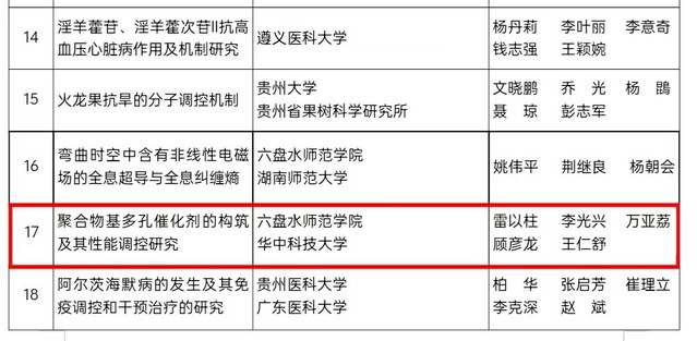 6月20日,贵州省人民政府发布了《关于2022年度贵州省科学技术奖励的决定》,我院教授雷以柱领衔完成的《聚合物基多孔催化剂的构筑及其性能调控研究》项目荣获贵州省自然科学奖三等奖。该奖由bat365和华中科技大学联合申报,bat365为第一完成单位,主要完成人为雷以柱、李光兴、万亚荔、顾彦龙、王仁舒。