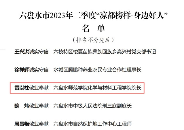 近日,六盘水市在全市广泛开展我推荐,我评议身边好人活动,在各级各单位及社会各界积极参与推荐下,涌现出一批助人为乐、见义勇为、诚实守信、敬业奉献、孝老爱亲的身边好人。经组织专家评审、征求意见、媒体公示等程序,吉红仙等55名同志入选2023年二季度凉都榜样·身边好人名单。其中,我院院长雷以柱入选六盘水市2023年第二季度“凉都榜样·身边好人”敬业奉献类名单。