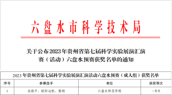 近日,六盘水市科学技术局公布了2023年贵州省第七届科学实验展演会演赛(活动)六盘水预赛获奖名单,我院伍晓平老师和欧阳远帆、熊刚两名同学的设计项目“一个小球--斜坡滚球实验”通过激烈角逐,斩获了2023 年贵州省第七届科学实验展演汇演活动六盘水预赛(成人组)一等奖。该团队将代表六盘水市参加贵州省第七届科学实验展演决赛。(供稿/伍晓平 编辑校对/陈体健 审核/吕选周)