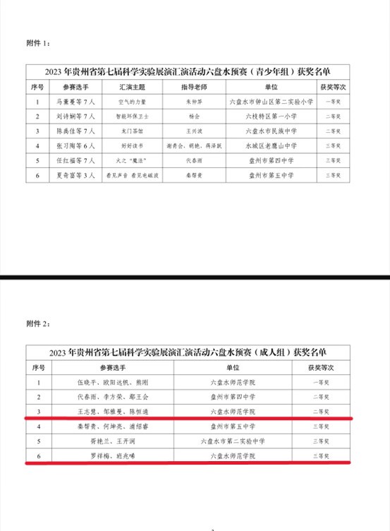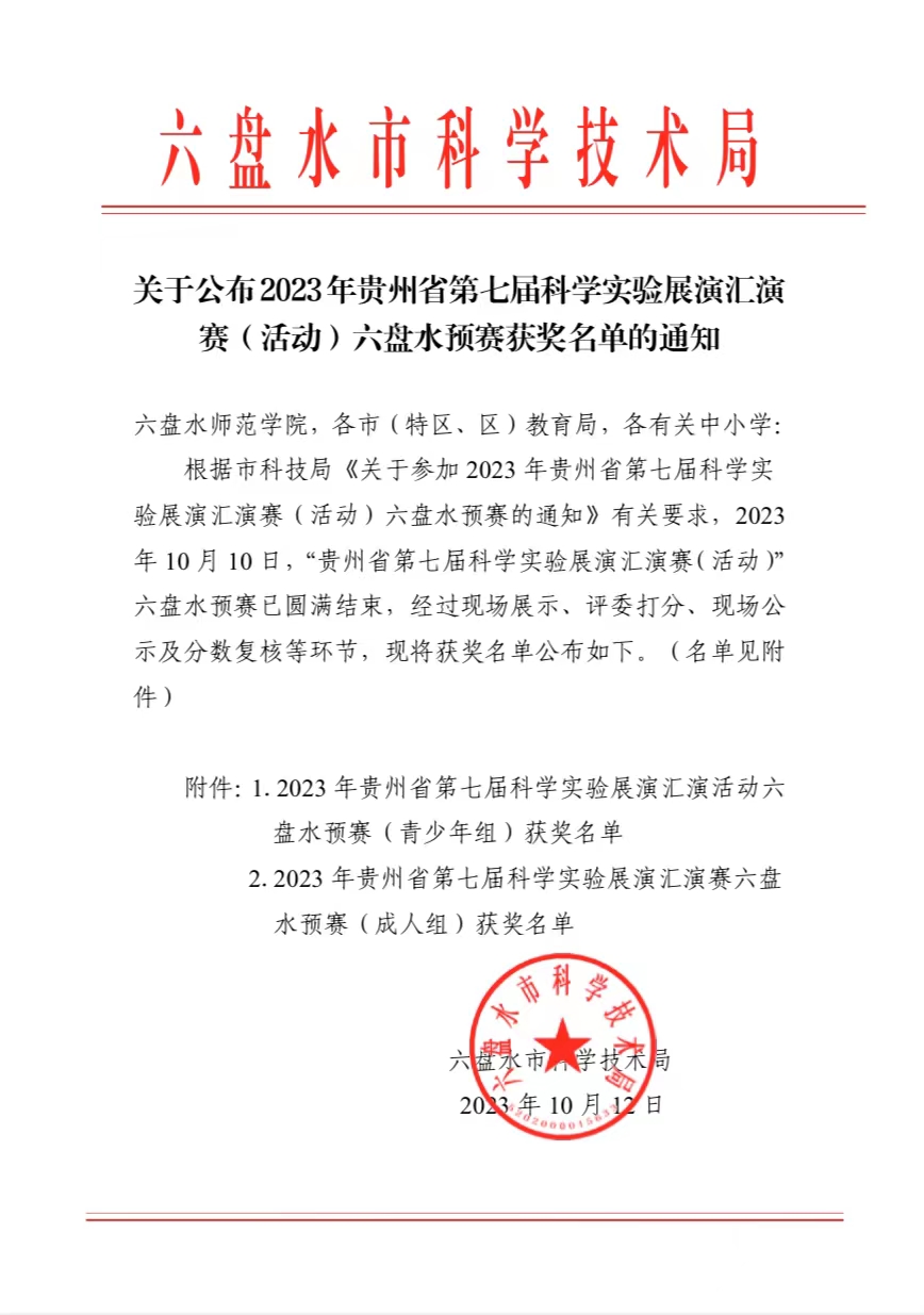 2023年10月10日,贵州省第七届科实验展演汇演赛(活动)六盘水预赛圆满结束。经评审,共评比出青少年组获奖队伍六队、成人组获奖队伍六队。