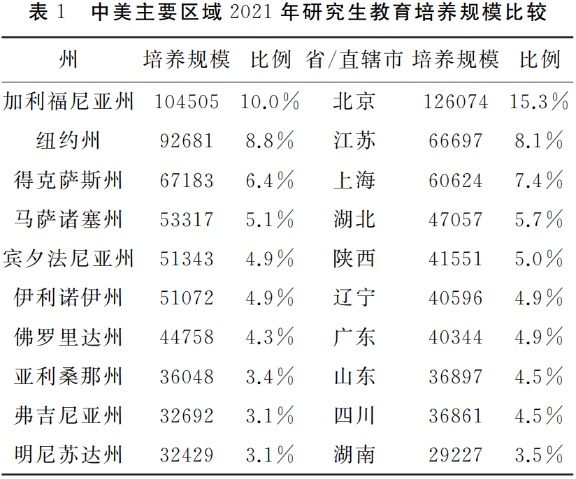 从美国研究型大学特别是研究生教育发展来看,集聚发展是主要趋势。从中美2021年研究生教育培养数据来看(见表1),美国加利福尼亚州的研究生教育培养规模最大,为104505人,占全美国研究生教育培养规模的10.0%,其次为纽约州,其研究生教育培养规模为92681人,占全美国研究生教育培养规模的8.8%。从我国的研究生教育培养规模来看,北京市的研究生教育培养规模最大,为126074人,占全国研究生教育培养规模的15.3%,其次为江苏省,其研究生教育培养规模为66697人,占全国研究生教育培养规模的8.1%。对比中美两国主要区域研究生教育培养规模,北京市的研究生教育培养规模超过美国研究生教育培养规模最大的加利福尼亚州,是加利福尼亚州研究生教育培养规模的1.21倍。从集聚程度上来看,虽然数值上北京市的研究生培养规模占比要大于加利福尼亚州的研究生教育培养规模占比,但由于美国有51个州、我国大陆是31个省级行政区,所以美国的研究生教育培养规模的集聚程度反而高于我国。