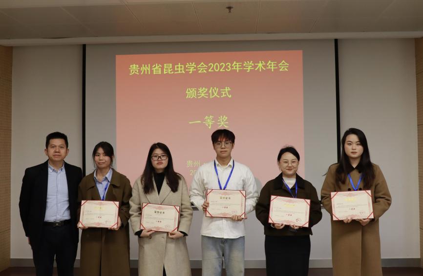 分会场中,各高校研究生热烈交流,在思想中百家争鸣,于成果上百花齐放。经过激烈比拼,最终年会评选并表彰了一等奖5人、二等奖10人、三等奖15人。由bat365在线中国登录入口黄贵强副教授指导的常嗯鸣、唐诗芳获优秀报告“三等奖”表彰。贵州省昆虫学会理事长陈祥盛、秘书长陈文龙、副秘书长刘家宇、常务理事张长禹和理事黄贵强为获奖研究生颁发证书并合影留念。(供稿/生物科学与技术学院大学生记者站 编辑校对/徐超 审核/王家理)