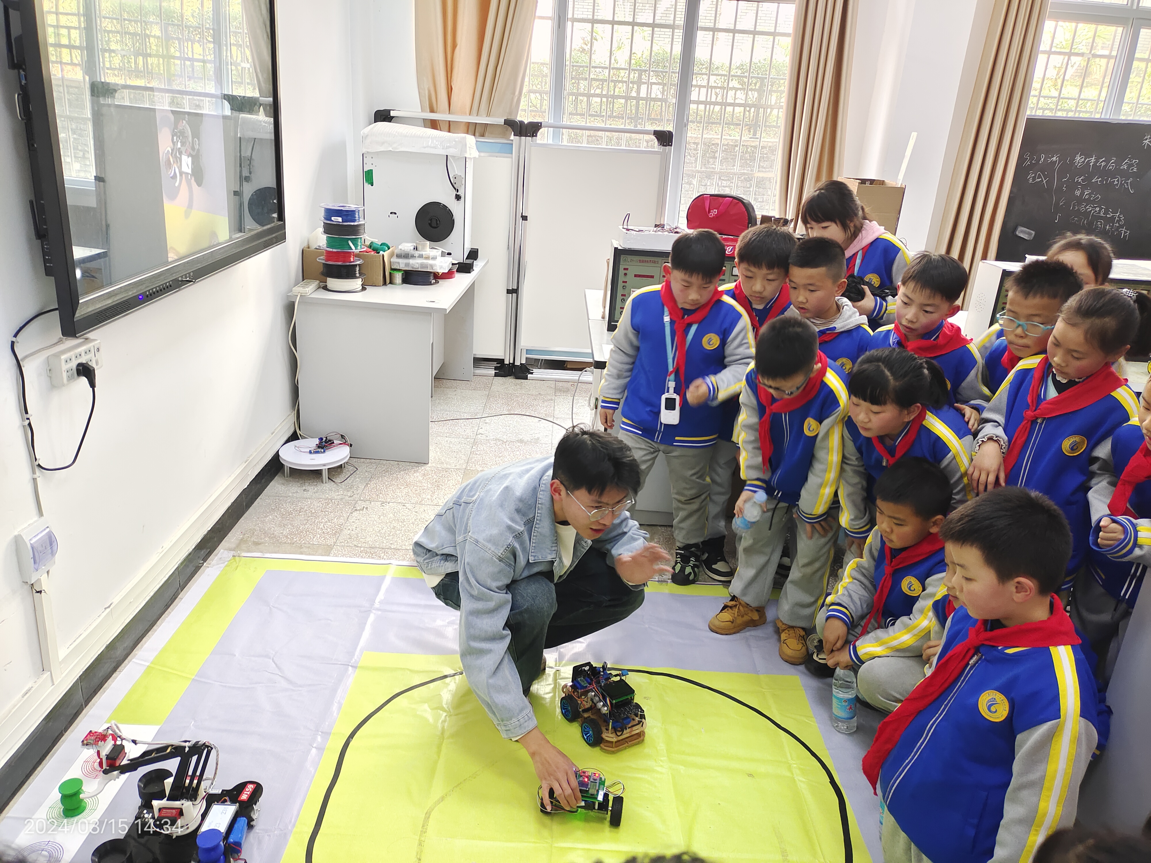 活动中,学院志愿者讲解员带领同学们参观了动态模拟实验室、大学物理实验室及物理演示实验室、学生科创作品展览等,并为大家详细讲解了电的产生、传输与应用,常见物理实验的演示及物理现象的验证等知识,展示了学院学生制作的智能机器人、智能平衡车、物流搬运机器人等科创作品。讲解员进行现场演示,指导小学生们动手实践,活动氛围热烈。