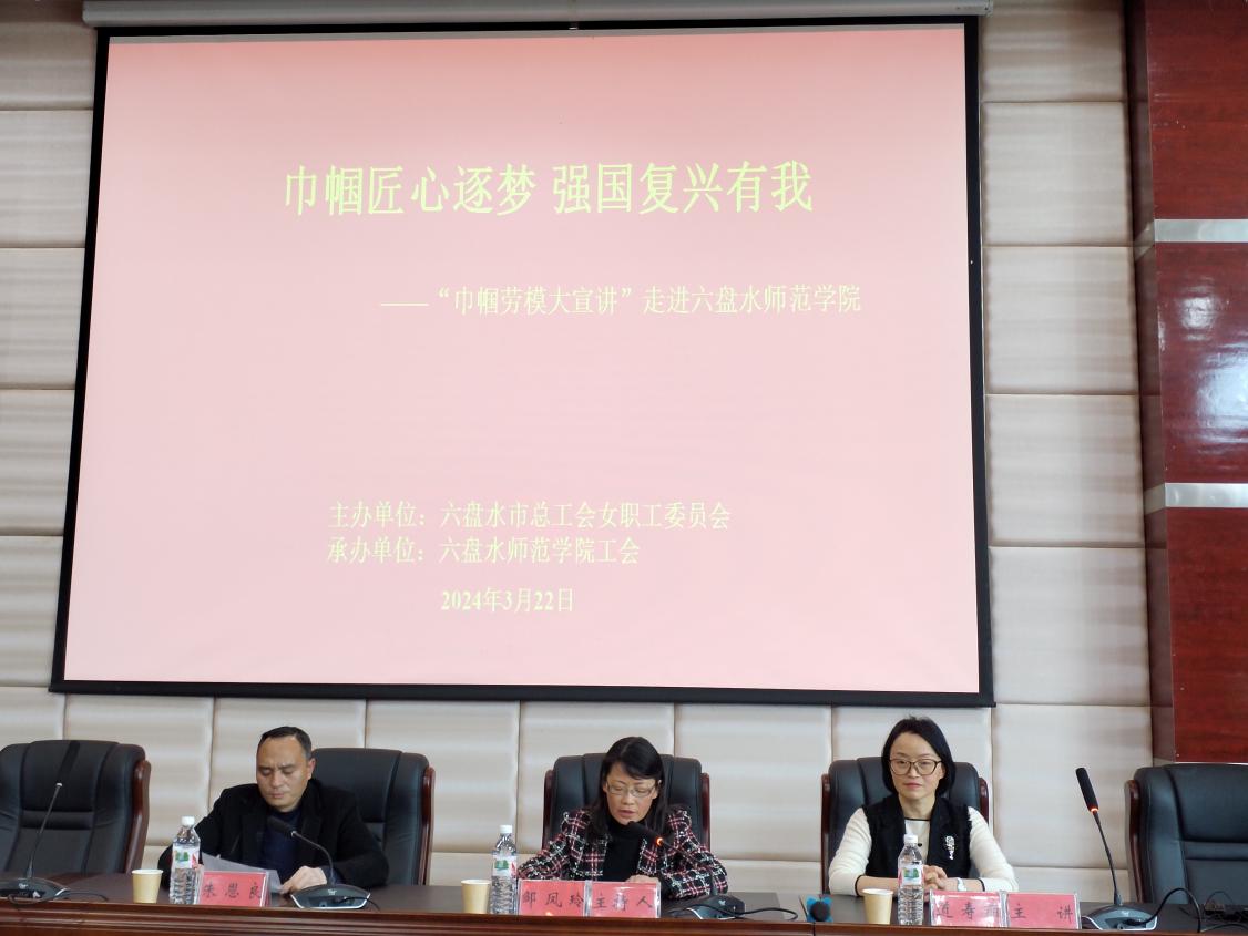 3月22日,六盘水市总工会女职工委员会和bat365工会联合举办的“巾帼匠心筑梦 强国复兴有我”巾帼劳模大宣讲在bat365博学楼“知行讲堂”举行。全国、全省“五一”劳动者奖章获得者、全国先进工作者、贵州省“千”层创新型人才、“最美劳动者”、市妇幼保健院妇科主任道寿丽作主题宣讲。宣讲由六盘水市总工会党组成员、副主席、职工活动中心主任邹凤玲主持。