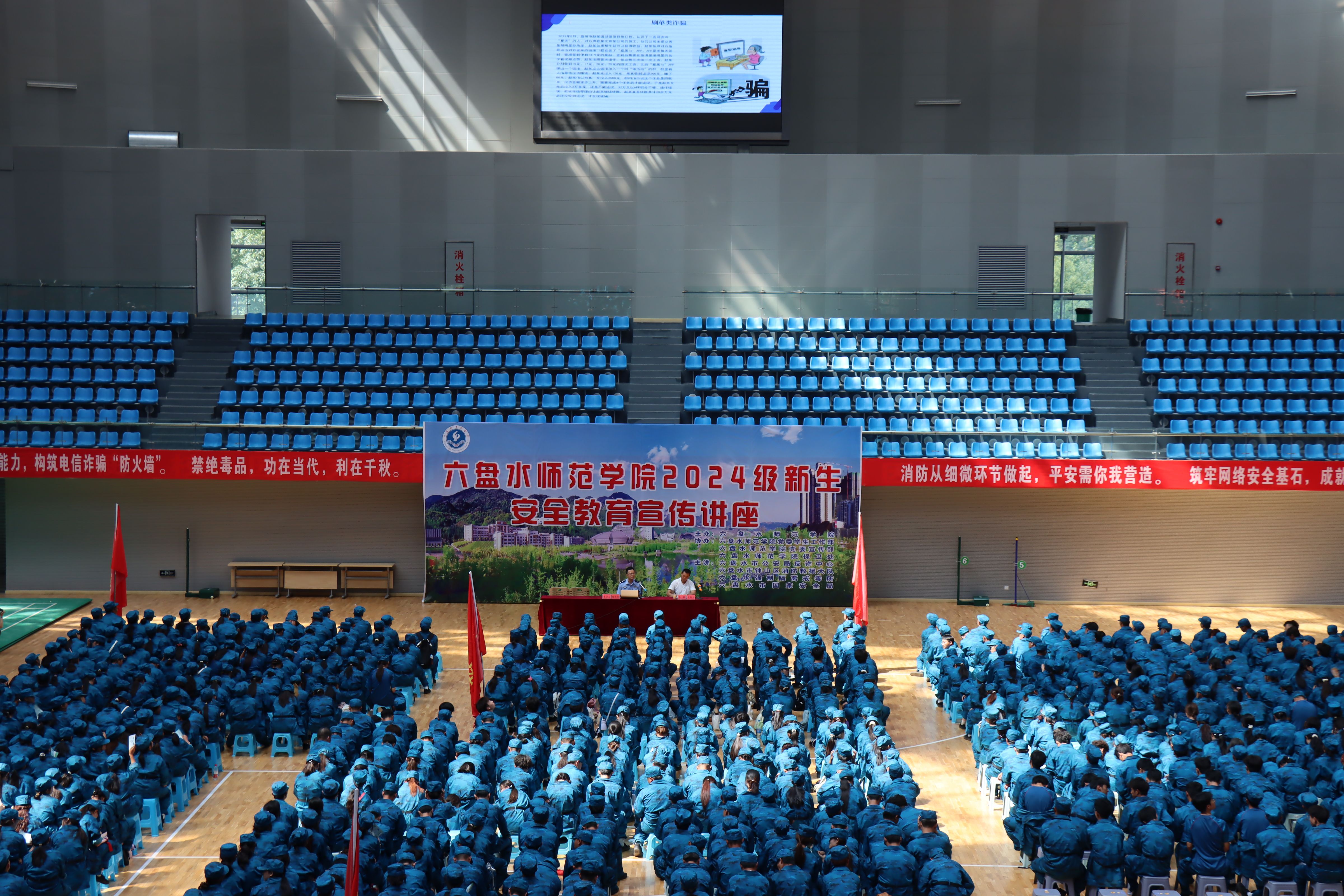 9月4日下午,bat365在体育馆举行2024级新生安全教育宣传讲座。本次讲座分为电信网络诈骗防范专题教育和消防安全教育两部分。讲座由学校保卫处处长余征主持。