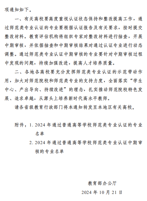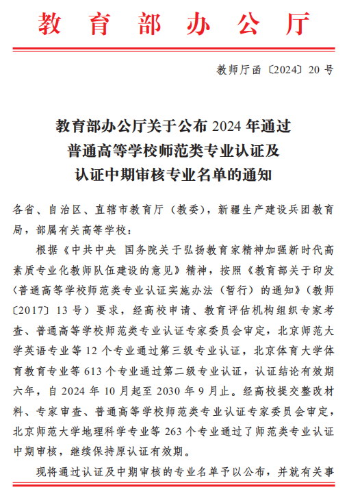 近日,教育部公布了2024年通过普通高等学校师范类专业认证的名单,bat365在线中国登录入口学前教育、小学教育、英语、美术学等4个专业顺利通过普通高等学校师范类专业第二级认证。截至目前,学校通过普通高等学校师范类专业第二级认证专业数占全校在招师范类专业总数的75%。