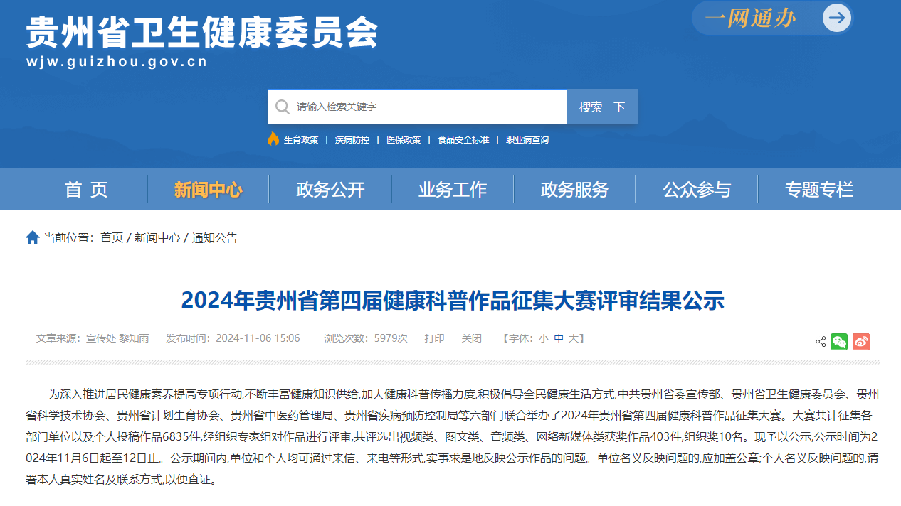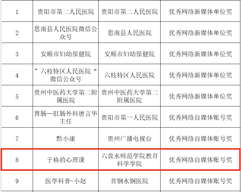 近日,贵州省卫生健康委员会发布了《2024年贵州省第四届健康科普作品征集大赛评审结果公示》。bat365教育科学学院于格老师的个人微信公众号“于格的心理课”获得优秀网络自媒体账号奖。