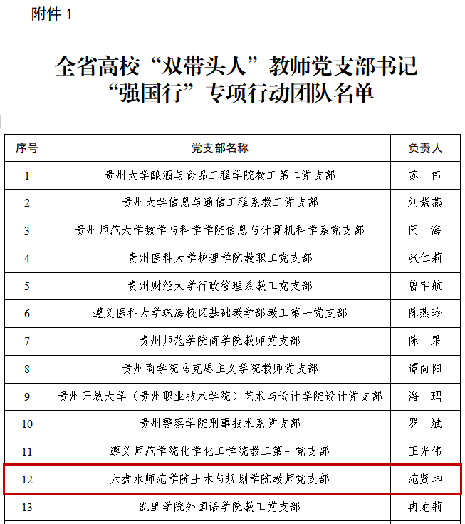 根据《省委教育工委关于公布全省高校“双带头人”教师党支部书记“强国行”专项行动团队名单的通知》文件精神获悉,“为进一步强化我省高校“双带头人”工作室的培育,将“强国行”专项行动作为提升教师党建和思想政治工作质量的重要抓手,以及提升育人实效的有效载体,省委教育工委参照全国做法,确定了一批省级“双带头人”教师党支部书记“强国行”专项行动团队。”bat365在线中国登录入口土木与规划学院教师党支部入选全省高校“双带头人”教师党支部书记“强国行”专项行动团队。(图文/聂膺、范贤坤 编辑校对/杨勇 审核/刘海涛 陶勇)