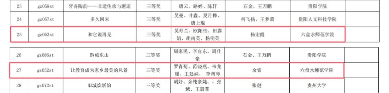余索老师指导,王周亮、张子涵同学创作的《畅游黔东南》和张玫同学创作的《守护校园:为成长撑起晴空》获数据多媒体类省级三等奖;余索老师指导,罗青菊、范晓燕、韦龙瑶、王廷妹、李帮琴同学创作的《让教育成为家乡最美的风景》和杨宏霞老师指导,吴寿兰、欧阳怡、田露娟、胡南英、杨明英同学创作的《和它说再见》获视听新媒体类省级三等奖。