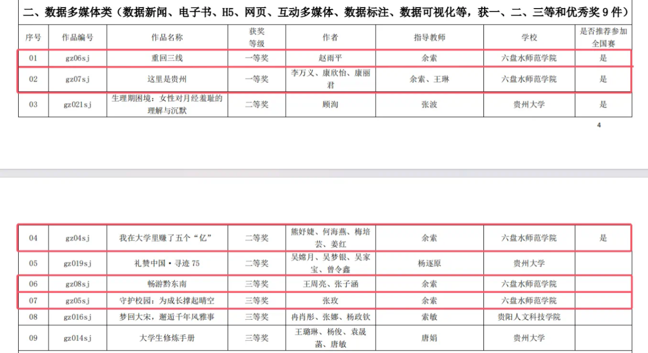 余索老师指导,赵雨平同学创作的《重回三线》;余索、王琳老师指导,李万义、康欣怡、康丽君同学创作的《这里是贵州》获数据多媒体类省级一等奖。