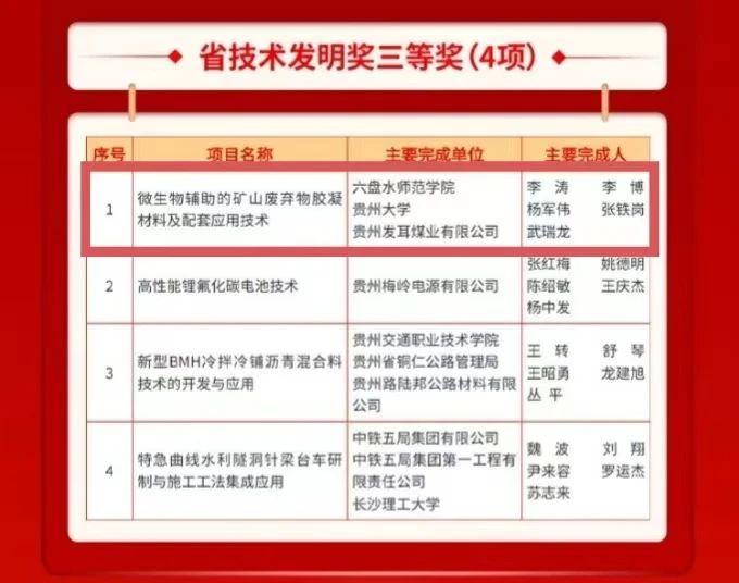 bat365矿业与机械工程学院李涛教授作为第一完成人,凭借“微生物辅助的矿山废弃物胶凝材料及配套应用技术”项目荣获贵州省技术发明奖三等奖!