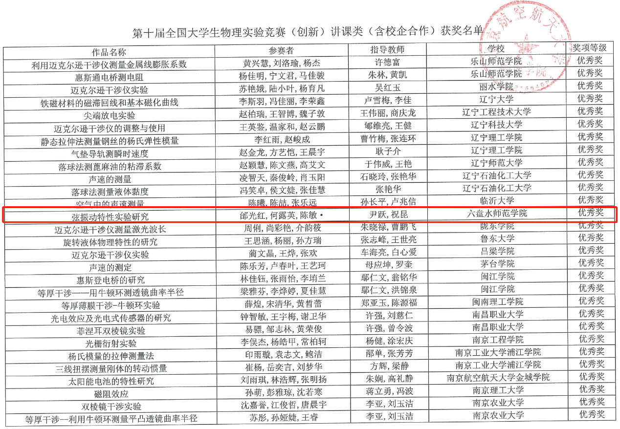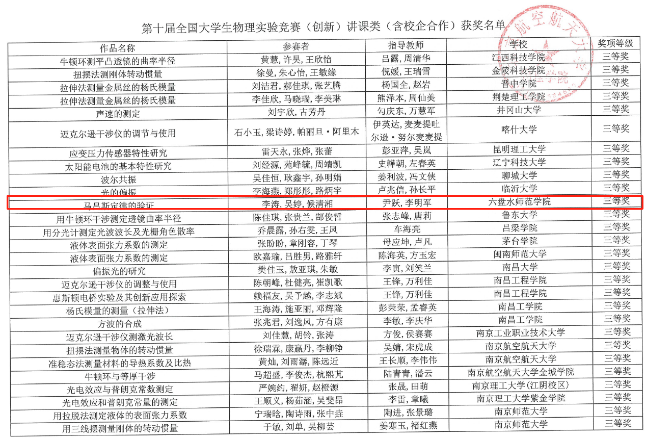 11月25日,第十届全国大学生物理实验竞赛(创新)决赛在北京航空航天大学沙河校区落下帷幕。来自全国31个省、自治区、直辖市以及香港、澳门地区的667所高校共2755支队伍参加了本次竞赛。经过校赛和西南地区赛的筛选,物理与电气工程学院5支队伍代表学校参赛。经过激烈角逐,2支队伍获得二等奖,1支队伍获得三等奖,2支队伍获得优秀奖,bat365获得优秀组织奖,