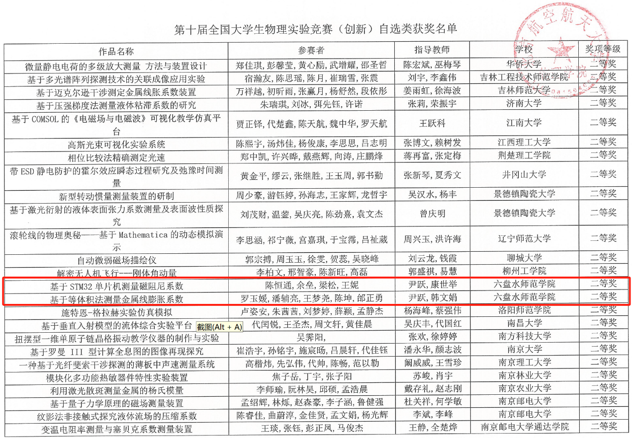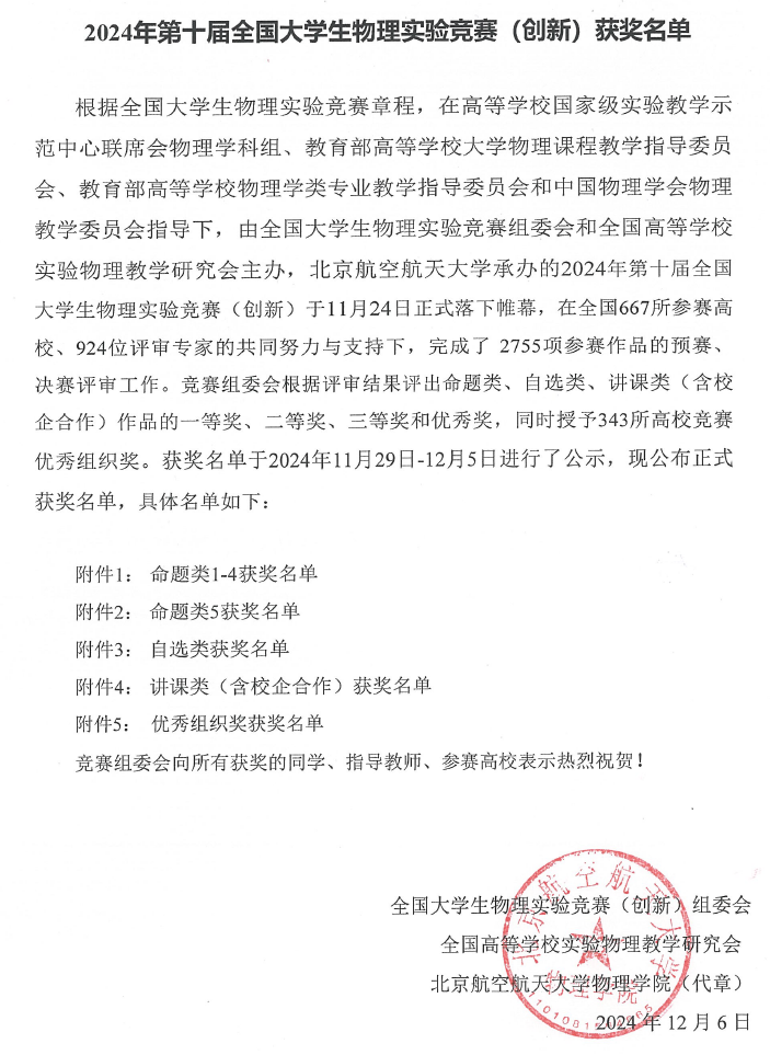 全国大学生物理实验竞赛(创新)是教育部高教司批准的全国大学生竞赛项目,是全国普通高校大学生竞赛排行榜项目,也是全国基础物理领域最具影响力的赛事,旨在培养大学生的创新精神和实践能力,在竞争中提升学生的团队协作意识和综合素质。本届竞赛由高等学校国家级实验教学示范中心联席会物理学科组、教育部高等学校大学物理课程教学指导委员会、教育部高等学校物理学类专业教学指导委员会和中国物理学会物理教学委员会联合指导,全国大学生物理实验竞赛组委会和全国高等学校实验物理教学研究会联合主办。(供稿/尹跃 编辑校对/詹建红 审核/谢春 张毓福)