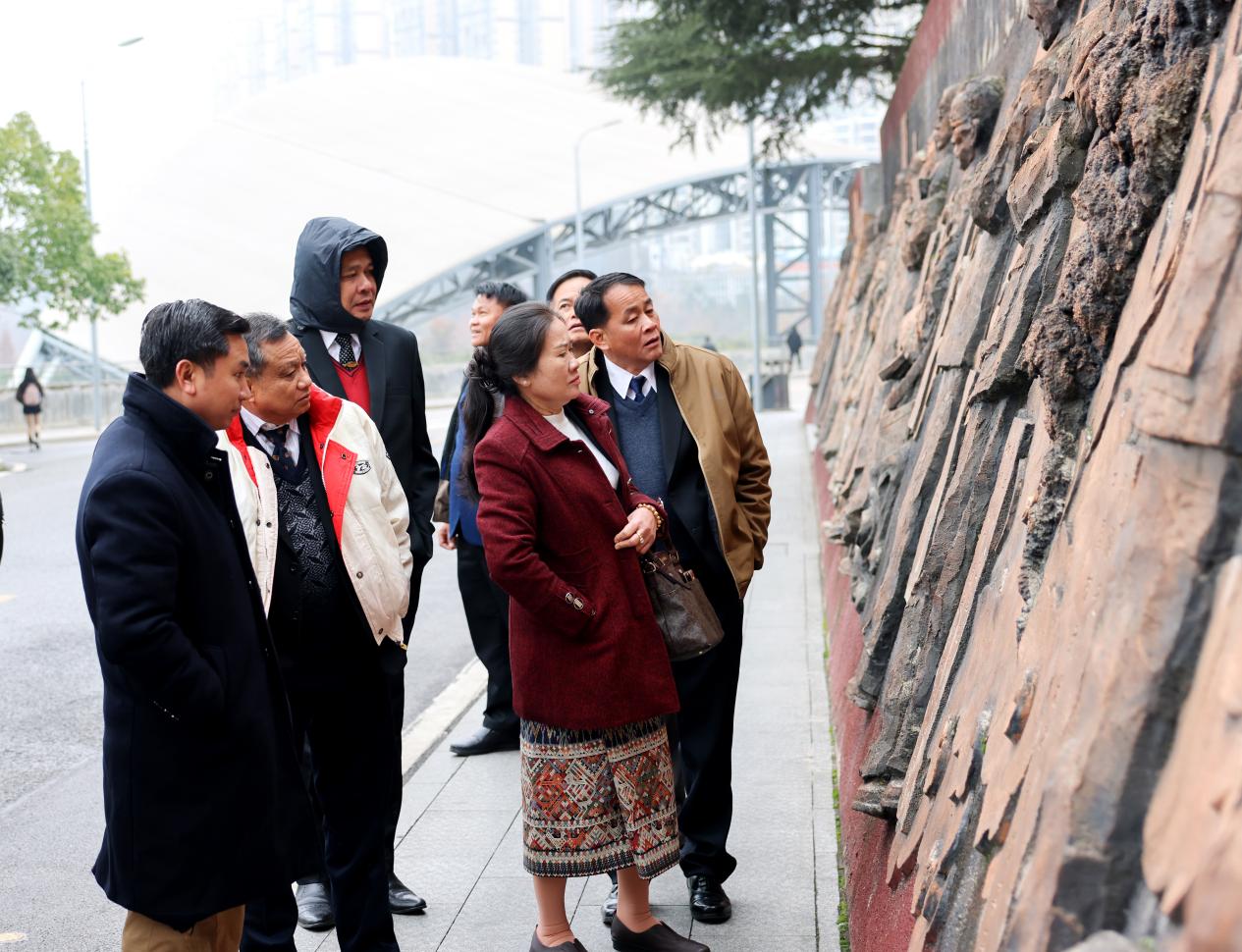 与会双方还互赠了纪念品,老挝教育访问团还进行了校内实地走访调研,参观了学校“中华魂”浮雕墙、国际学生寝室、图书馆、国际学生教室等。