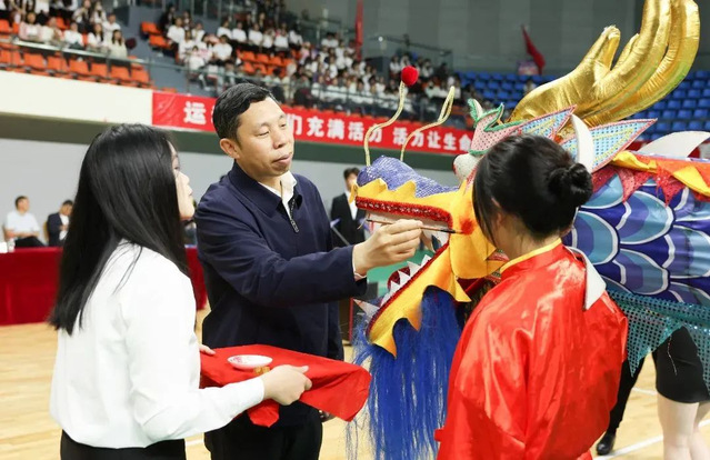 开幕式上,运动员代表黄敏、裁判员代表杨祖涛依次宣誓。校领导为龙狮点睛。