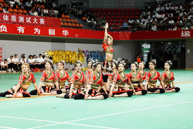 文体表演环节精彩纷呈,体育学院的龙狮表演气势恢宏,巨龙腾跃、雄狮威武;教育科学学院《青春同行》舞蹈以灵动舞姿展现青春风采;艺术学院《阿达达琦》舞蹈展现民族风情,现代舞《你要跳舞吗》活力四射;武术表演《星耀中华》刚柔并济,尽显中华武术精髓;跳绳表演《歌唱祖国》压轴,将现场气氛推向最高潮。