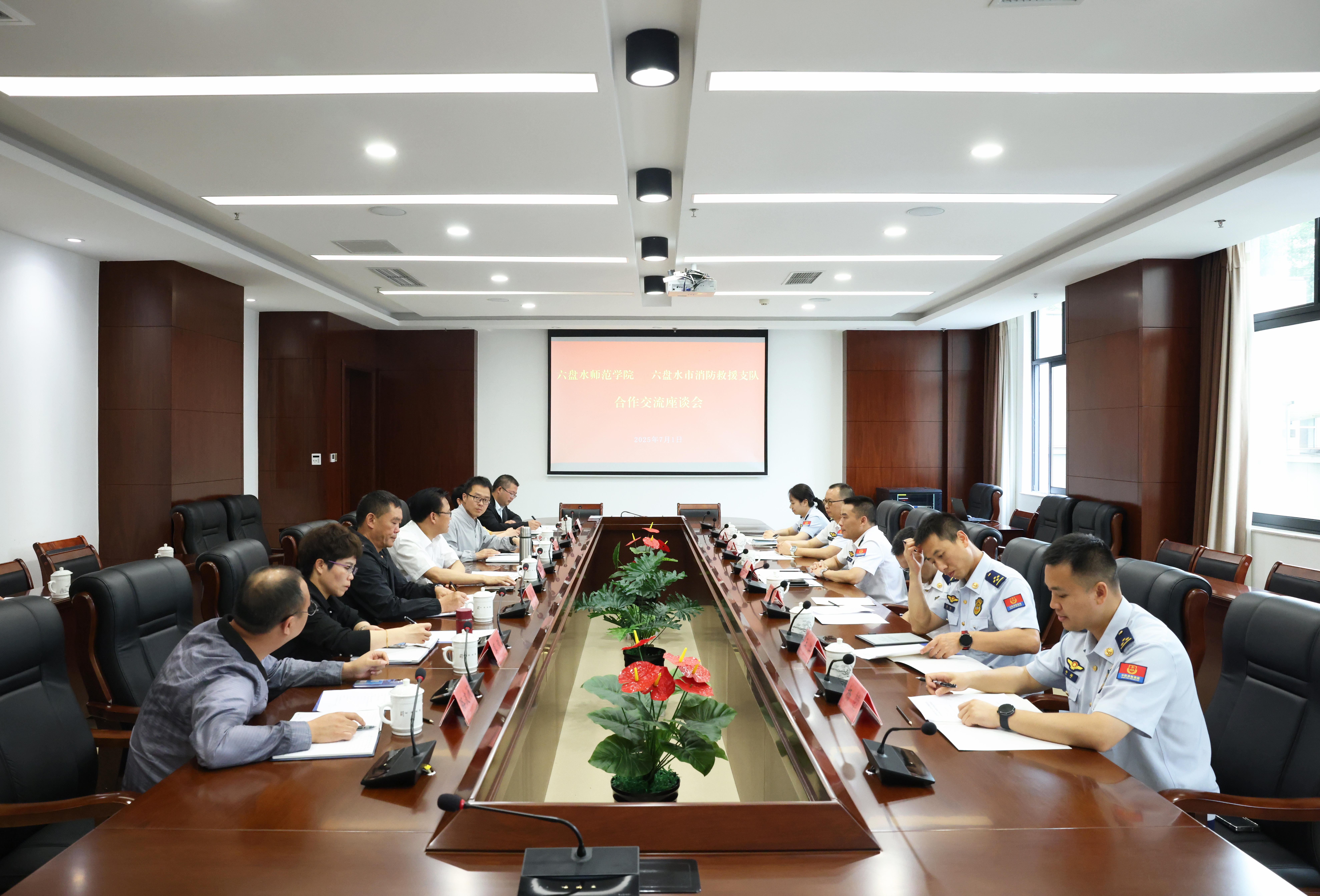 7月1日上午,六盘水市消防救援支队党委书记、政治委员张快一行到学校交流座谈。学校党委委员、副校长王际明、牛伟,市消防救援支队党委委员、副政治委员廖昆参加。