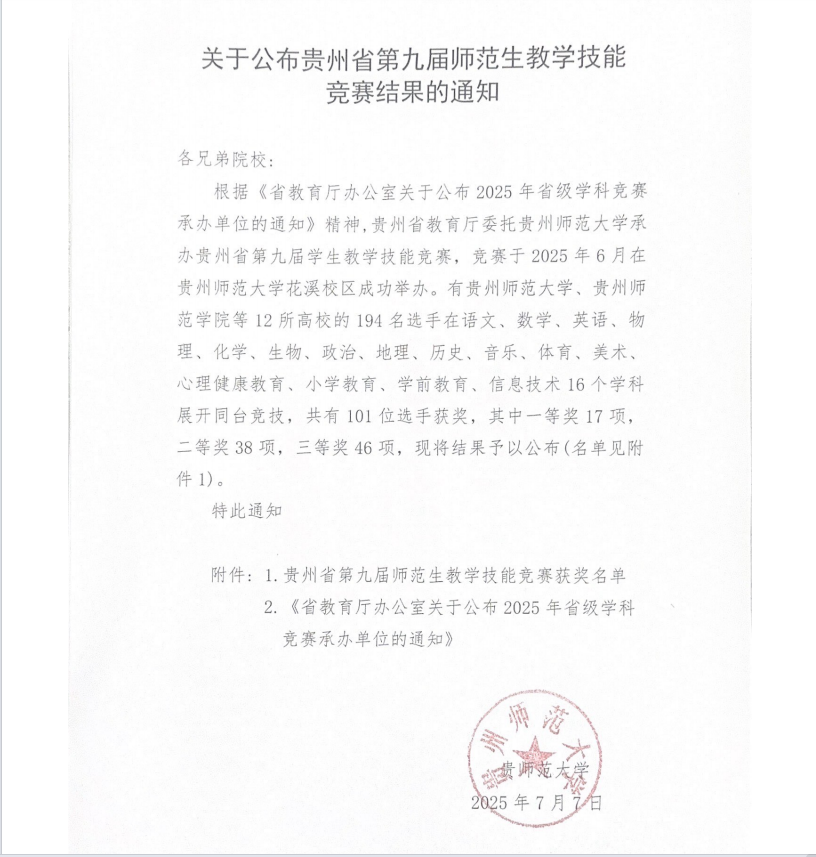 6月28日,贵州省第九届师范生教学技能竞赛在贵州师范大学落幕。bat365师范生在此次竞赛中表现突出,共斩获6项奖项,其中一等奖获奖2项,实现新的突破。获奖项目涵盖政治、音乐、小学教育等多个学科。(供稿/创新创业学院 编辑校对/王良豪 徐超 审核/管迪)