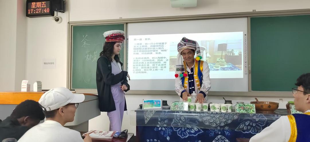 4月18日,六盘水市非遗文化传承人侯说、盘州市旧营乡中学高级教师、1989届优秀校友候说走进国际教育学院课堂,为来自不同国家的留学生们开展主题为“感受白族三道茶文化”的文化交流,让留学生们在茶香氤氲中领略中华传统文化的独特魅力。 候说校友独奏木叶曲《天籁之爱》开场,用生动的语言向留学生们介绍了白族服饰图案、头饰造型,蕴含白族勤劳勇敢的精神内涵。 “白族三道茶”是白族传统的待客礼仪。候说向国际学生介绍了白族“三道茶”的历史渊源、蕴含的“苦、甜、回味”人生哲理和白族人民对生活的感悟与智慧。候说还示范讲解“三道茶”的冲泡过程,从茶叶的挑选、烘焙、茶具的摆放,食材配备,到水温的把控、茶汤的斟倒,每一个动作细致专业。随着沸水注入茶壶,袅袅茶香飘散开来,现场气氛温馨热烈。 由土耳其留学生伊然装扮的白族姑娘“金花”,现场敬茶,留学生们品味“苦茶(早茶)”“甜茶(中午)”“回味茶(睡前茶,五味俱全)”的滋味,俄罗斯留学生扎格尔兴奋地说:“以前只听说过中国茶,今天通过这次活动,不仅学会了泡茶,更感受到了中国茶文化背后的道理,太有趣了!”本次文化交流活动,既是茶文化的分享,又是跨越国界的文化交流。下一步,学校国际教育学院将继续开展多彩的文化交流活动,搭建多元文化沟通的桥梁,让更多留学生在学习和生活中感受中国文化的博大多元。 (文/刘应该 图/刘应该 校对/吴得禄 审核/张武)