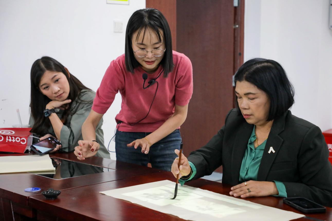 泰国罗勇府教育局来访领导一行还进行了校内文化建设考察,参观图书馆、国际学生寝室、国际学生教室等地,深入课堂观摩国际生中文课教学。