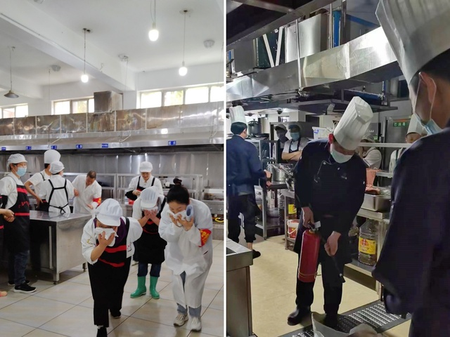 内容:饮食及商业服务部组织食堂工作人员进行消防安全培训,重点针对油锅起火处理、消防设施使用等,采取理论培训和实操结合的方式,提升食堂工作人员的消防安全意识。