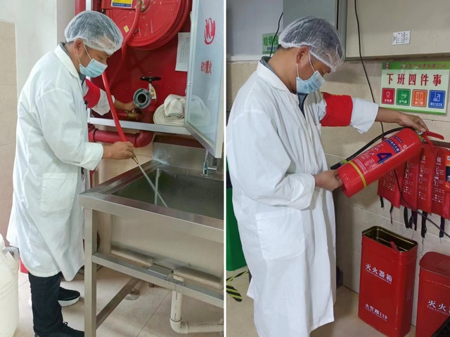 内容:校内食堂开展全面消防安全自查,工作人员仔细检查消防栓、灭火器的功能及摆放位置,确保灭火器放置在易燃区域的附近,且易于取用。同时,排查燃气管道、阀门,杜绝泄漏风险,营造安全校园餐饮环境。