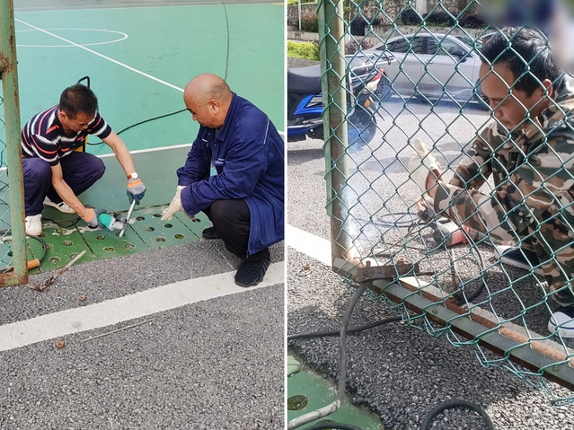 内容:维修工作人员迅速响应师生反馈,得知朝阳校区篮球场围网门存在破损问题,影响日常通行,他们立即携带专业工具前往现场进行紧急修复工作,以确保校园环境的安全与顺畅。