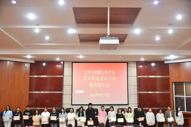 9月19日,化学与材料工程学院在博学楼知行讲堂组织召开学风革命启动大会暨表彰大会。学院领导、教学科研管理科科长、学生科科长、各教学系主任、辅导员、班主任出席会议,2024级全体新生及其他年级学生代表参加会议。