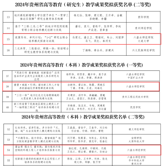 1月2日,贵州省教育厅对2024年贵州省高等教育省级教学成果进行公示,我院荣获3项教学成果奖。白新伟老师团队获高等教育(本科)教学成果奖一等奖,骆红超老师团队获高等教育(本科)教学成果奖二等奖,马爱元老师团队获高等教育(研究生)教学成果奖二等奖。