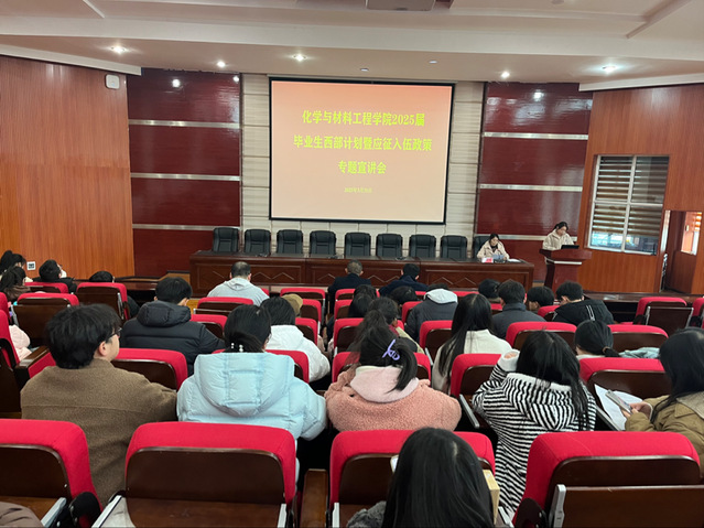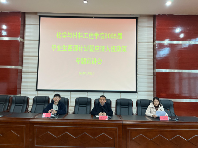 为积极响应国家号召,鼓励青年学子投身西部建设、报效祖国,进一步推动大学生志愿服务西部计划以及应征入伍工作,3月31日下午,化学与材料工程学院在博学楼知行讲堂召开了2025届毕业生西部计划暨应征入伍政策专题宣讲会。院党委副书记钱育林、团委书记王蒙蒙、学生科刘行老师出席宣讲会,2025届全体毕业生参与会议。会议由王蒙蒙主持。