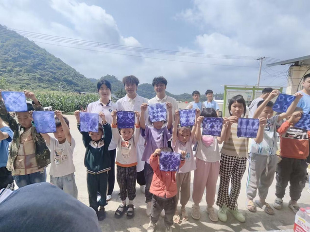 扎染活动中,队员们用普通话讲解技术要点,孩子们在染出斑斓图案的同时,也对化学与艺术的融合充满向往。此外,实践队员还走进布依族奶奶家中,以普通话为载体,将老人口述的服饰刺绣技艺转化为文字记录与视频资料,让这项传统手艺突破地域限制。“普通话是最暖的桥,一头牵系乡愁,一头通往广阔天地。” 实践团队长伍思仪穿戴起布依族服饰,深切感受到语言背后的文化分量。