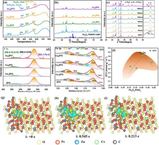 该研究工作开发了一种铈掺杂ZnFe2O4尖晶石催化剂(CenZFO),通过氧空位调控与相结构优化,成功解决了CO2制烯烃反应中活化与C—C偶联的平衡难题。Ce3+的引入使氧空位浓度显著提升至29.3%,增强了CO2吸附并抑制甲烷生成。最优催化剂在290 ℃、2 MPa条件下实现38.1%的CO2转化率和46.5%的低碳烯烃选择性。研究表明Ce掺杂促进Fe3O4向Fe5C2转化,降低反应能垒,并稳定关键活性相。催化剂展现70小时稳定运行能力,活性衰减低于5%。该工作通过“掺杂-空位-相调控”协同策略,为CO2高效转化提供了新途径。(供稿/环境工程系 编辑校对/耿忠武 审核/王毅红 钱育林)