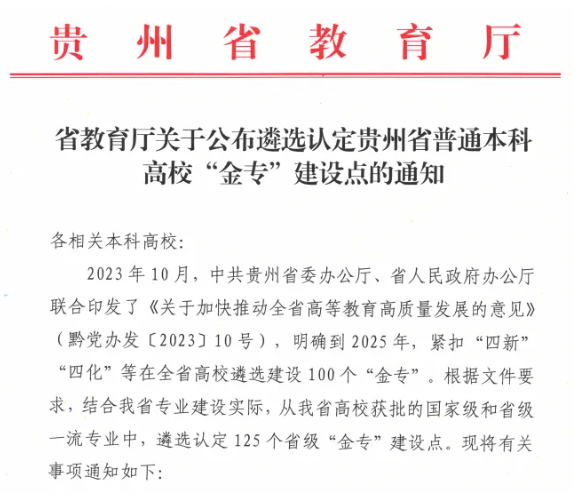 近日,贵州省教育厅公布了《关于遴选认定贵州省普通本科高校“金专”建设点的通知》,我院化学工程与工艺专业获批省级“金专”建设点。
