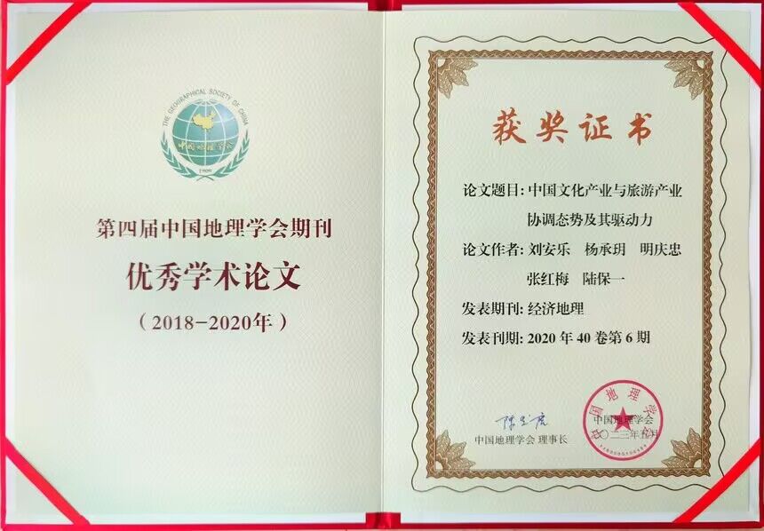 5月26日至28日,在广东东莞召开的中国地理学会春季年会上,我院刘安乐博士和杨承玥老师发表在期刊《经济地理》2020年40卷第6期的论文“中国文化产业与旅游产业协调态势及其驱动力”荣获“第四届中国地理学会优秀学术论文(2018-2020)”。