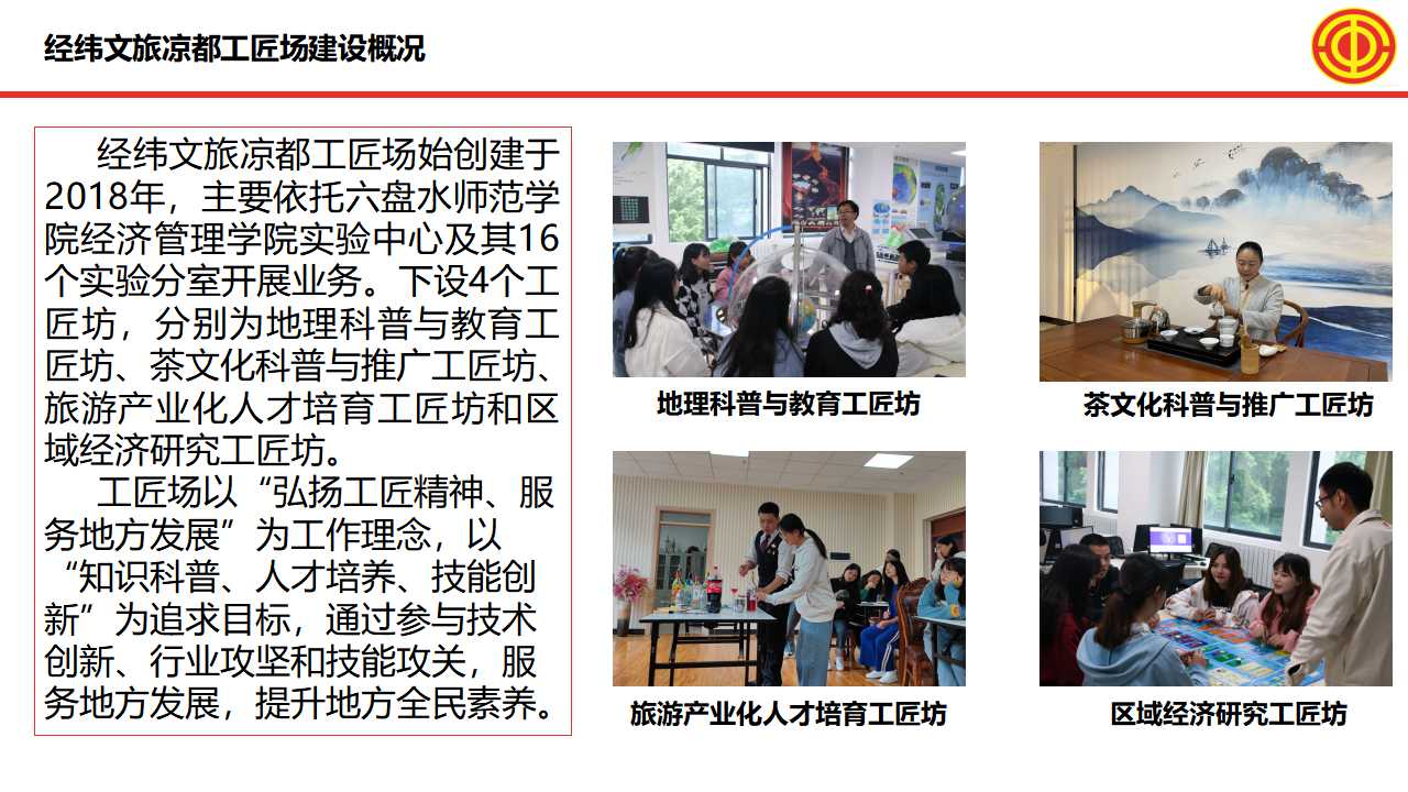 据悉,参与申报创建的工匠场和工作室围绕单位生产、技术瓶颈、设备改造、发明创造、新技术推广运用等方面进行攻关,取得了较好成绩,培养了一批学习型、知识型、技术型、创新型的高技能工匠人才队伍,为助力六盘水高质量发展提供了坚强人才支撑。经济管理学院“经纬文旅”凉都工匠场的创建以六盘水地方文化旅游资源为主要支持,旨在通过地理科学知识科普与教育、茶文化科普与推广、凉都文化旅游人才培育以及基础经济学知识普及与研究,不断提升全民文化素养,提高地方文化旅游行业服务水平,为地方旅游产业化提供支持。