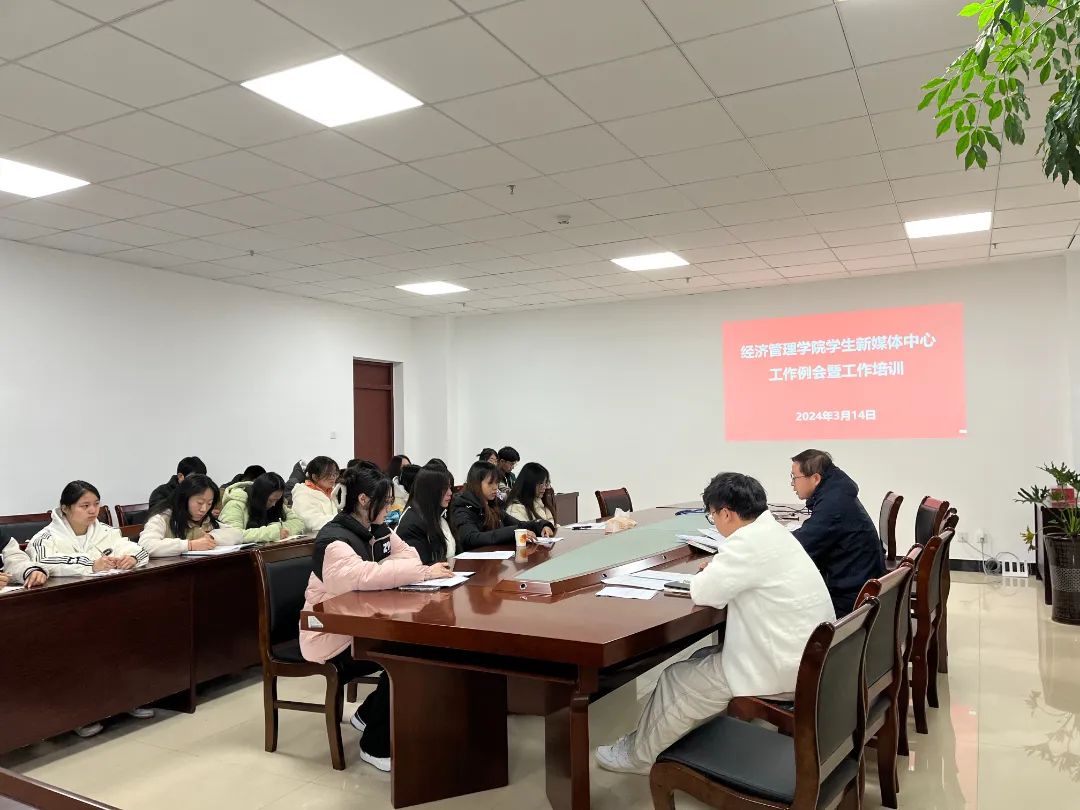 近日,经济管理学院学生新媒体中心在翰学楼621开展2023-2024学年第二学期第一次工作会议,学院党委副书记张春生出席会议,学生科副科长石凯,指导教师孙庆玲及学院新媒体中心全体成员参加本次会议。石凯主持会议。
