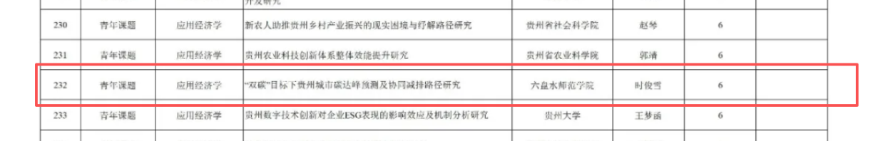 时俊雪老师主持申报的《“双碳”目标下贵州城市碳达峰预测及协同减排路径研究》项目,成功获批为贵州省2023年度哲学社会科学规划青年课题。该课题紧密围绕国家“碳达峰、碳中和”重大战略目标,聚焦贵州省城市低碳发展的关键问题,运用科学预测模型与系统分析方法,探索符合省情的协同减排路径。其研究不仅具有重要的理论价值,更能为贵州的区域绿色低碳发展提供扎实的理论支撑与实践参考,彰显了我院青年教师在服务国家战略前沿领域的敏锐视角与研究潜力。